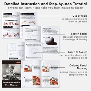 - STEP-BY-STEP DRAWING TUTORIAL: Comes with a useful booklet, which contains detailed instructions of each tool, general skill and knowledge for drawings, and step-by-step drawing tutorials to help you get started with your first step in the art world. Start creating your masterpiece now or take your art into an advanced level, this drawing kit will bring you a great progress in your art journey.