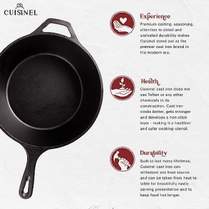 - SUPERIOR PRE-SEASONED CRAFTSMENSHIP – Crafted to last for generations, Cuisinel sources the highest quality materials in casting our cookware. Cuisinel cast iron is notoriously safer than teflon or other non-stick materials. Continuous easy-to-follow seasoning will result in a safe, healthy and virtually non-stick pan. After every use, cast iron should be hand washed, dried thoroughly on the stove at medium heat and seasoned with natural oils; Do not put in dishwasher and do not air dry.