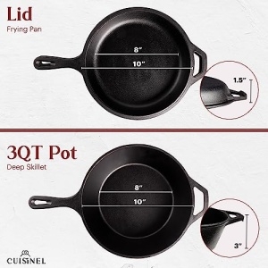 - MULTI-PURPOSE PAN + LID COMBO: This versatile multi cooker set allows you to use the 3-Quart deep pan together with the lid as a dutch oven, deep dryer or braiser – or use separately to sear up double the amount of burgers or steaks or create an entire meal in the 2 pans. The cast iron lid can withstand the temperatures of any oven or open fire.