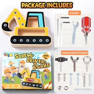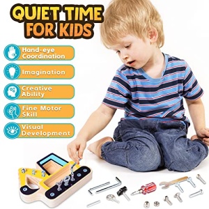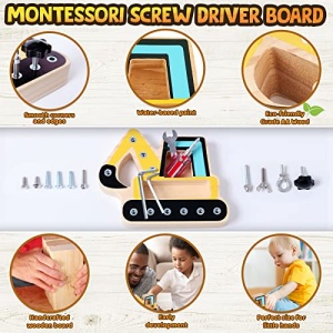 - 🚚【 HIGH-QUALITY TOY WITH NON-TOXIC MATERIAL】Everything included is made up of high quality and with the safest and non-toxic material to make sure your child spends their time longer and much safer. Our screwdriver board is made of safe wood with a curved edge design without any sharp edges. Smooth corners and surfaces make it comfortable to play with tiny hands and ensure safety at maximum.