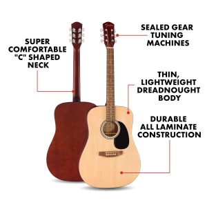 - The easy to play “C” – shaped neck, walnut fingerboard and light weight all-laminate body allow for a smooth and comfortable playing feel, and the sealed-gear tuning machines allow for accurate tuning, with a walnut bridge for optimal tone production