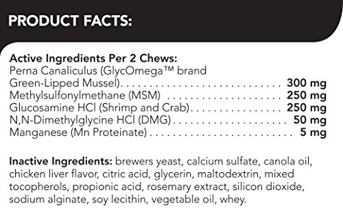 Active Ingredients Per 2 Chews: Perna Canaliculus (GlycOmega brand Green Lipped Mussel), 300 mg; Methylsulfonylmethane (MSM), 250 mg; Glucosamine HCl (Shrimp and Crab), 250 mg; N,N-Dimethylglycine HCl (DMG), 50 mg; Manganese (as Mn Proteinate), 5 mg. Inactive Ingredients: brewers yeast, canola oil, chicken liver flavor, citric acid, glycerin, mixed tocopherols, propionic acid, proprietary blend (maltodextrin, sodium alginate and calcium sulfate), rosemary extract, silicon dioxide, soy lecithin, vegetable oil, whey.